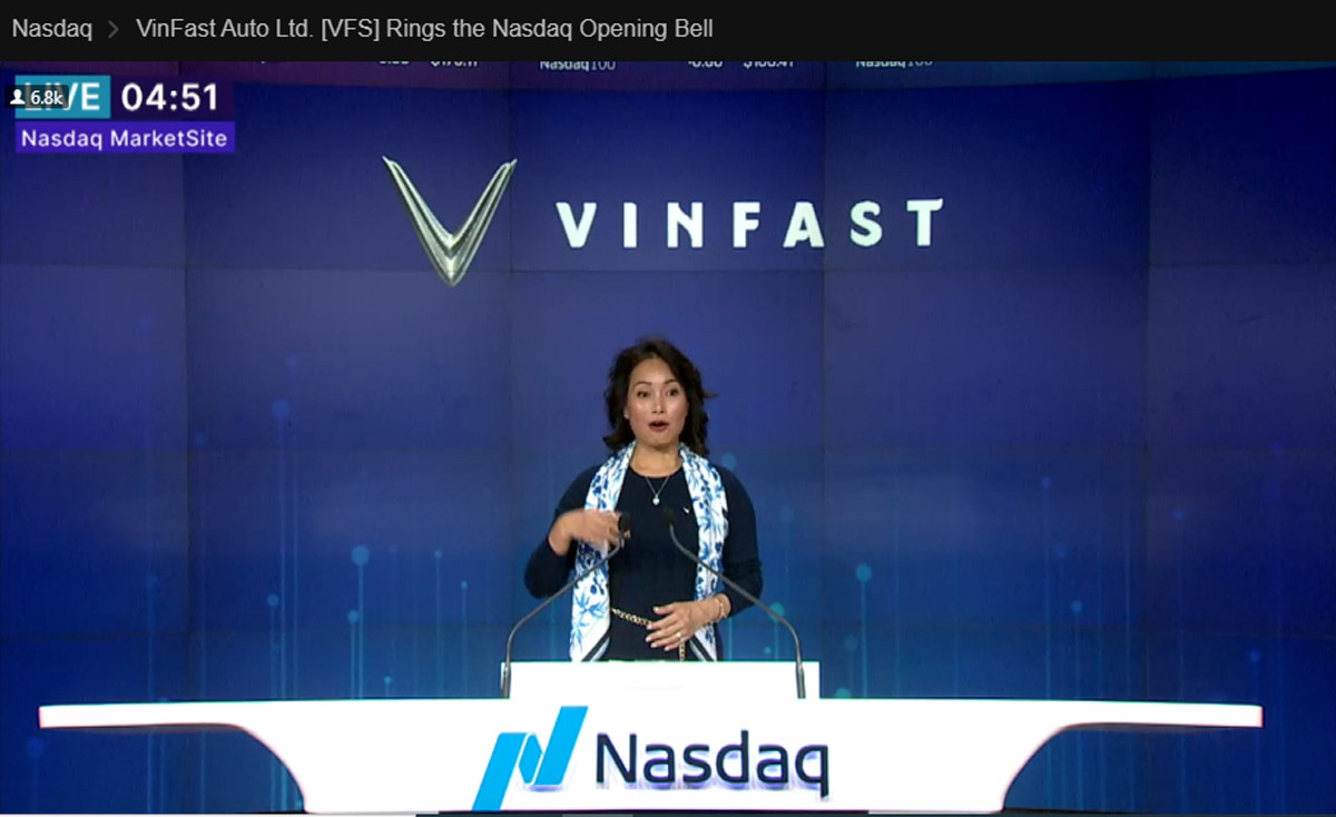 Ngày 15/8, VinFast chính thức niêm yết cổ phiếu sàn chứng khoán Nasdaq của Mỹ. Kết thúc phiên giao dịch, cổ phiếu VFS vọt lên trên ngưỡng 37 USD. Với hơn 2,3 tỷ cổ phiếu, vốn hóa của VinFast đạt 85 tỷ USD, vượt Ford, General Motors và nhiều hãng xe danh tiếng.