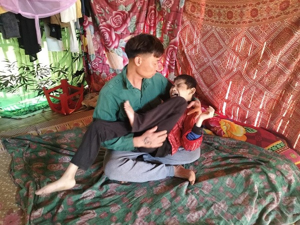 Làm công nhân xa nhà, lần nào trở về quê, anh Trưởng Văn Trọng (SN 1985) cũng đều không giấu được sự lo lắng khi chứng kiến con trai Trưởng Văn Tuấn lăn lộn, gào khóc. Dù đã 16 tuổi nhưng Tuấn vẫn chỉ như một đứa trẻ sơ sinh, nằm một chỗ, không nhận thức được thế giới xung quanh và chưa biết nói.