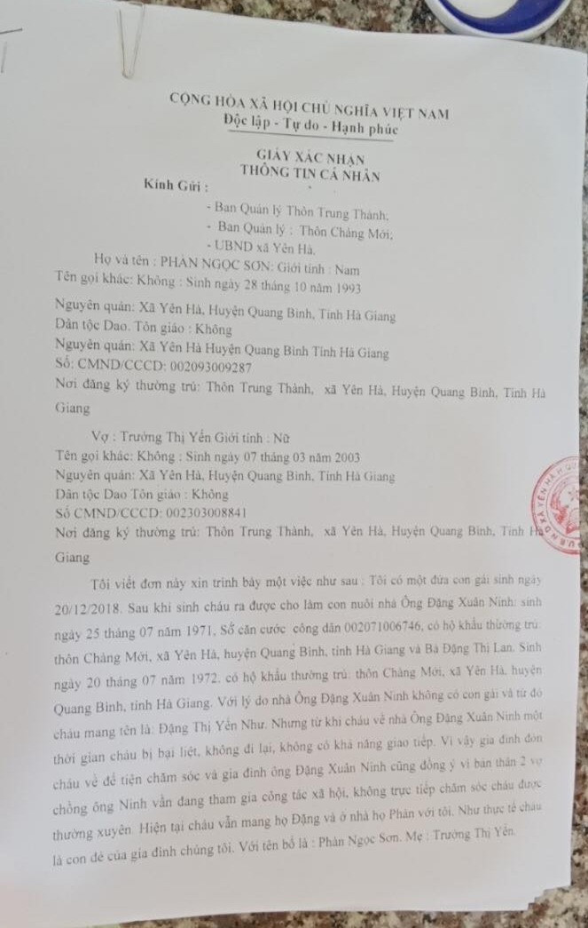 Ông Phàn Văn Phong, Trưởng thôn Trung Thành, xã Yên Hà chia sẻ: Cháu Đặng Thị Yến Như là con gái của vợ chồng anh Phàn Ngọc Sơn. Do hoàn cảnh gia đình khó khăn, anh chị cho bé Như đi làm con nuôi, tiếc rằng cháu mắc bệnh bại não nên được đón về. Vợ chồng anh Sơn đều làm nông, kinh tế khó khăn, bởi vậy việc cho con điều trị là điều nằm ngoài khả năng của họ.