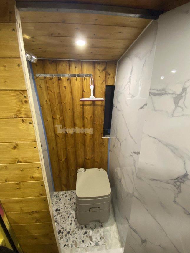 Khu vực nhà vệ sinh, bếp có 2 phần. Đầu tiên là nhà vệ sinh với bồn cầu di động và vòi tắm hoa sen, vòi xịt rửa cùng kích thước nhỏ gọn 700 x 800 mm. Xung quanh nhà vệ sinh cũng được ốp gỗ thông và tấm nhựa giả đá. Trong khi đó, khu vực bếp là được lắp ghép rất hợp lý với 3 ngăn kéo đựng dụng cụ bếp, 1 ngăn tủ, chứa bình nước thải và bình nước uống 20 lít. Ở đây còn có kệ treo bên trên đặt hệ điều khiển, công tắc đèn, đồng hồ đo pin, đo công suất tiêu thụ.