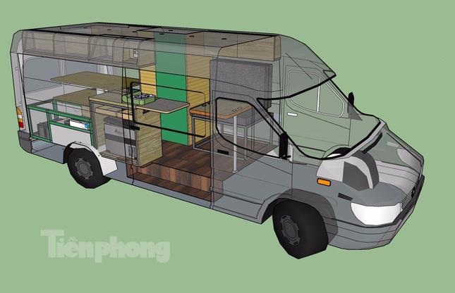 Xe được chia làm ba khu giống như một “căn nhà” thực thụ bao gồm giường nhỏ, giường lớn và khu vực nhà vệ sinh, gian bếp. Ghế sau ghế tài xế được anh “độ lại” để có thể kéo ra tạo thành chiếc giường nhỏ đủ cho 2 con của anh sử dụng. Trong khi đó, phần giường lớn có thể chuyển đổi công năng thành bàn ăn gia đình. Ngoài ra, đây cũng là nơi chứa đồ đạc sinh hoạt, giúp tiết kiệm được lượng lớn không gian trong xe.
