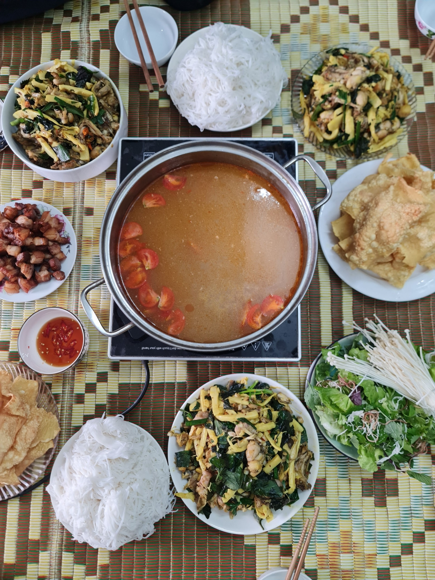 Nước lẩu hầm xương, dùng cà chua làm màu, cho ít mẻ hoặc dấm bỗng cho dậy mùi. Tôi ra vườn hái xà lách, kinh giới, tía tô, hoa chuối…để nhúng lẩu.