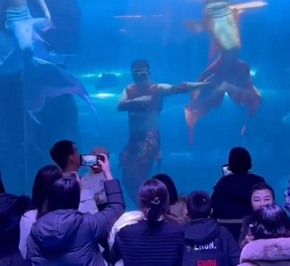 Phong cách biểu diễn của anh đã khiến du khách đến thăm Thế giới Đại dương Zhongtai Trường Xuân ở tỉnh Cát Lâm (Trung Quốc) cũng như nhiều người trên mạng thích thú.