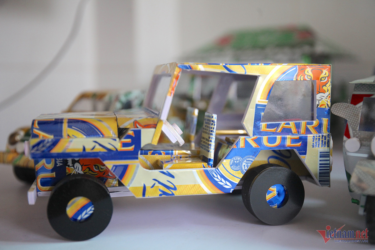 Dù bằng vỏ lon nhưng mỗi loại xe đều được thiết kế giống như thật. Đặc biệt, anh Trí còn sáng tạo các loại máy bay, trực thăng, thuyền bằng vỏ lon rất tinh tế.