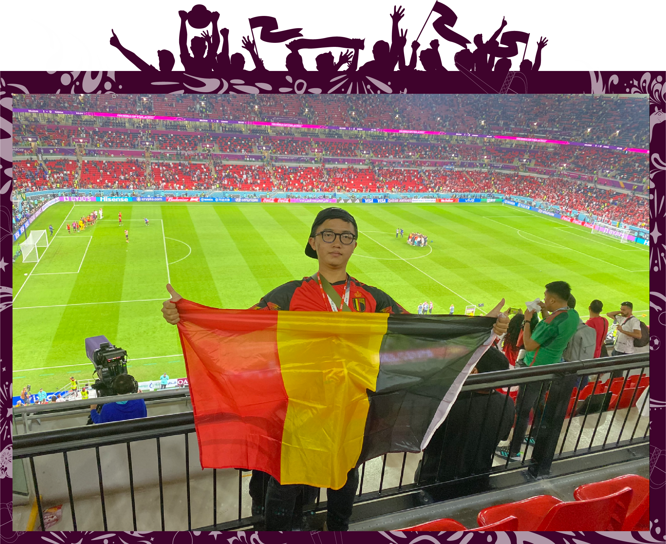 Thái mặc áo và cầm quốc kỳ của Bỉ, check-in trước trận đấu vòng bảng giữa Bỉ và Canada. 9X cổ vũ cho đội tuyển Bỉ vì có thần tượng anh yêu thích là Eden Hazard.