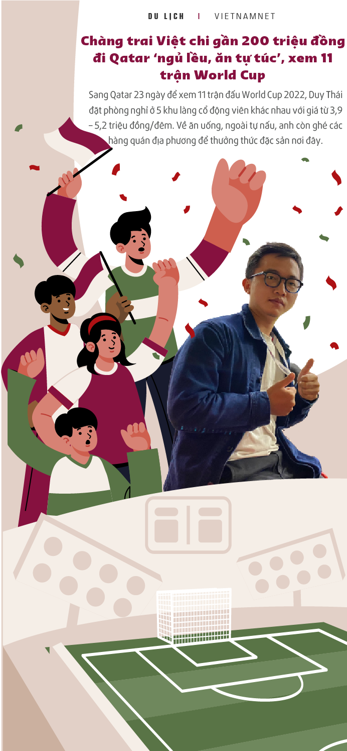Sang Qatar 23 ngày để xem 11 trận đấu World Cup 2022, Duy Thái đặt phòng nghỉ ở 5 khu làng cổ động viên khác nhau với giá từ 3,9 – 5,2 triệu đồng/đêm. Về ăn uống, ngoài tự nấu, anh còn ghé các hàng quán địa phương để thưởng thức đặc sản nơi đây.