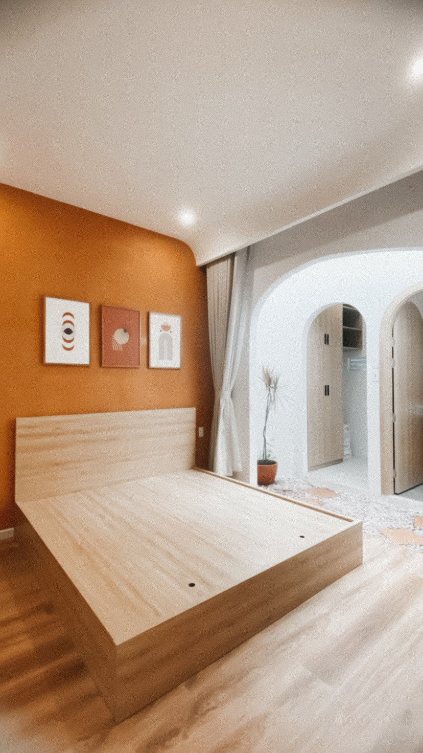 Phòng ngủ mini trên tầng lửng, nhóm thiết kế đặt thêm một bàn làm việc kiêm bàn trang điểm ở gần khu cửa sổ đón ánh sáng, tạo năng lượng tích cực mỗi ngày cho gia chủ.