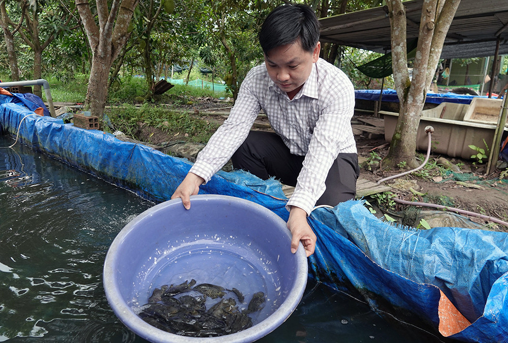 Giữa trưa tháng 10, anh Nguyễn Trí Thức tất bật cho đàn cá tai tượng da beo ăn. Anh Thức hiện là Phó Bí thư Đoàn thanh niên thị trấn Ngã Sáu.