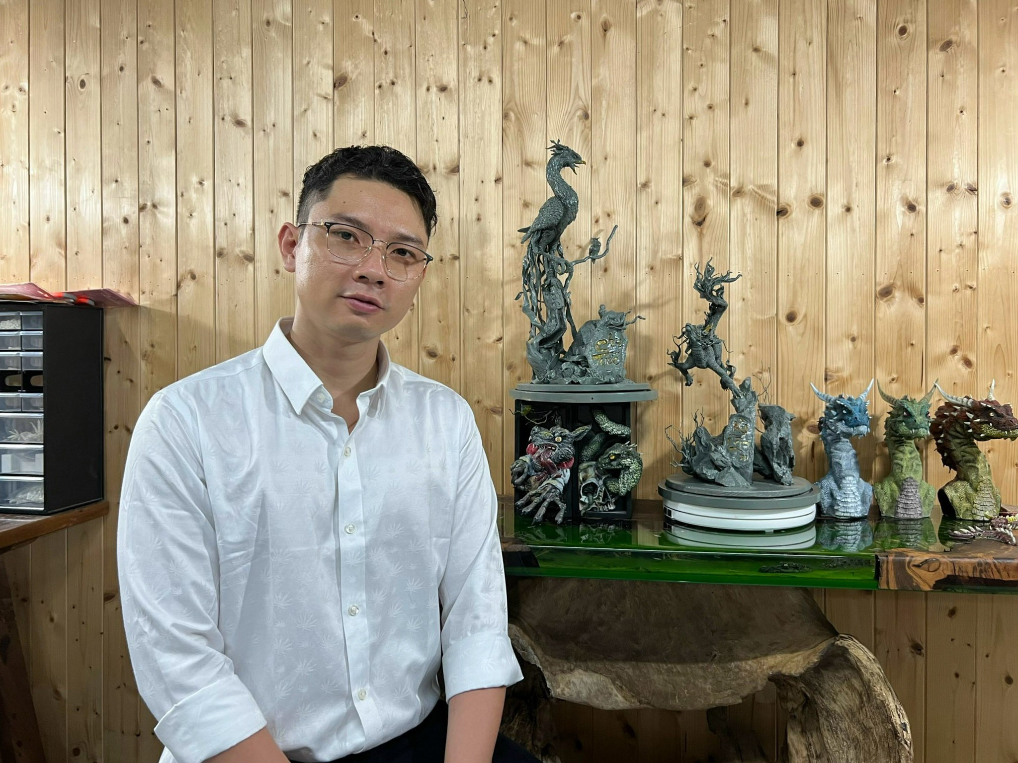 Nguyễn Hải Âu vốn làm nghề thiết kế nội thất. Chàng trai đam mê nặn tượng đất sét từ năm học lớp 8. Lớn lên, anh tìm hiểu bộ môn nghệ thuật này trên mạng và từ những video hướng dẫn, Âu làm được những sản phẩm như đầu rồng hay những sinh vật trong các bộ phim viễn tưởng.