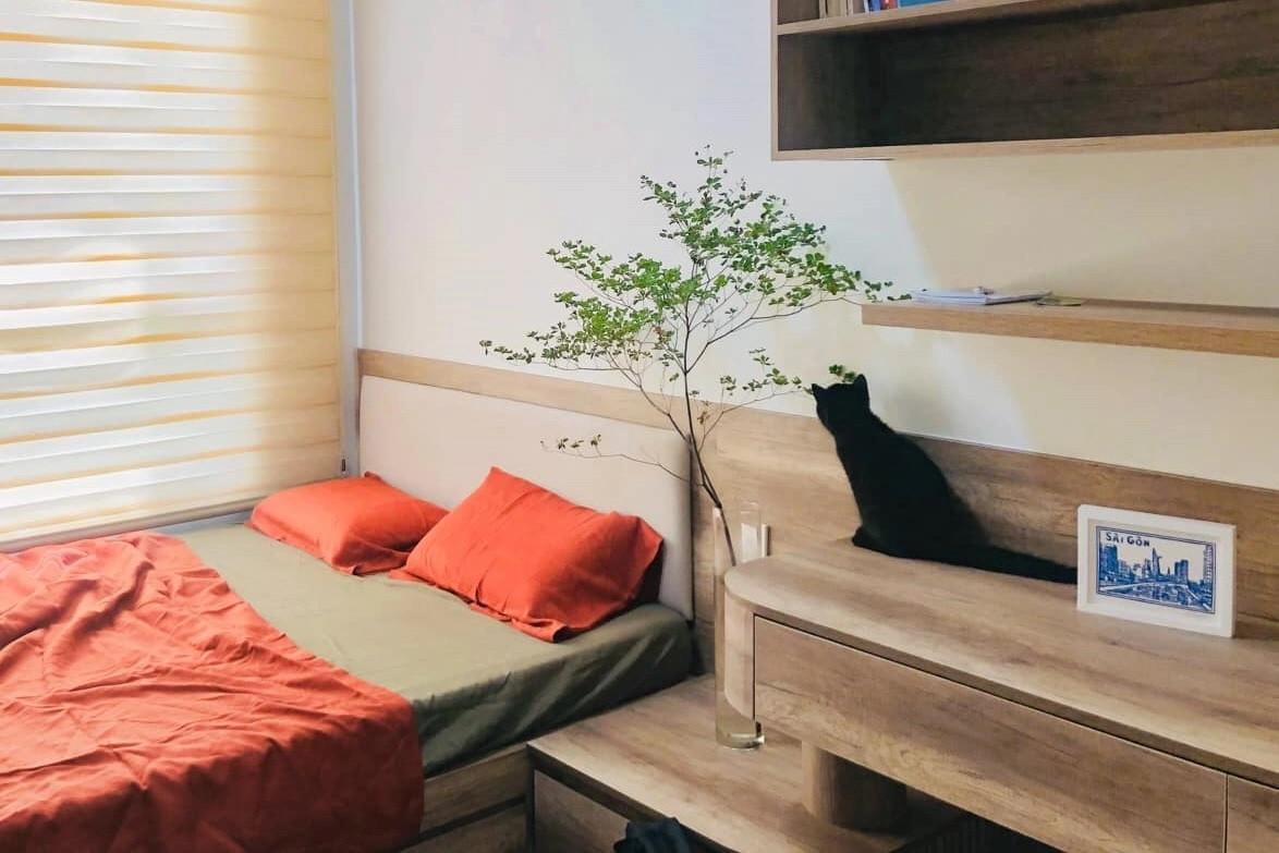 Phòng ngủ cũng theo phong cách tối giản, chất liệu chủ đạo là gỗ. Để giúp không gian bớt nhàm chán, tôi khéo léo chọn một bộ chăn ga gối màu cam.