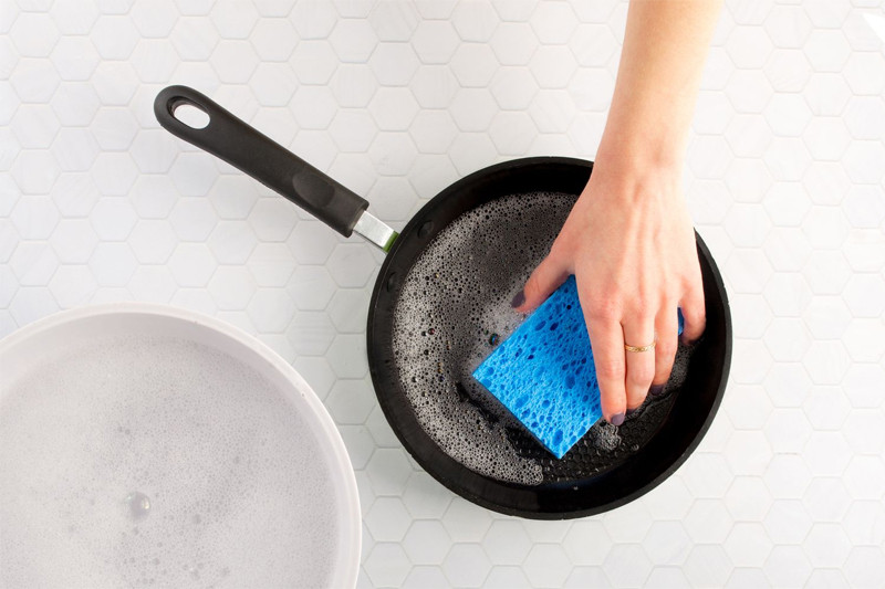 - Cách rửa: Nhẹ nhàng rửa chảo bằng miếng bọt biển và xà phòng, nước ấm. Tránh sử dụng miếng cọ rửa kim loại làm trầy xước bề mặt.