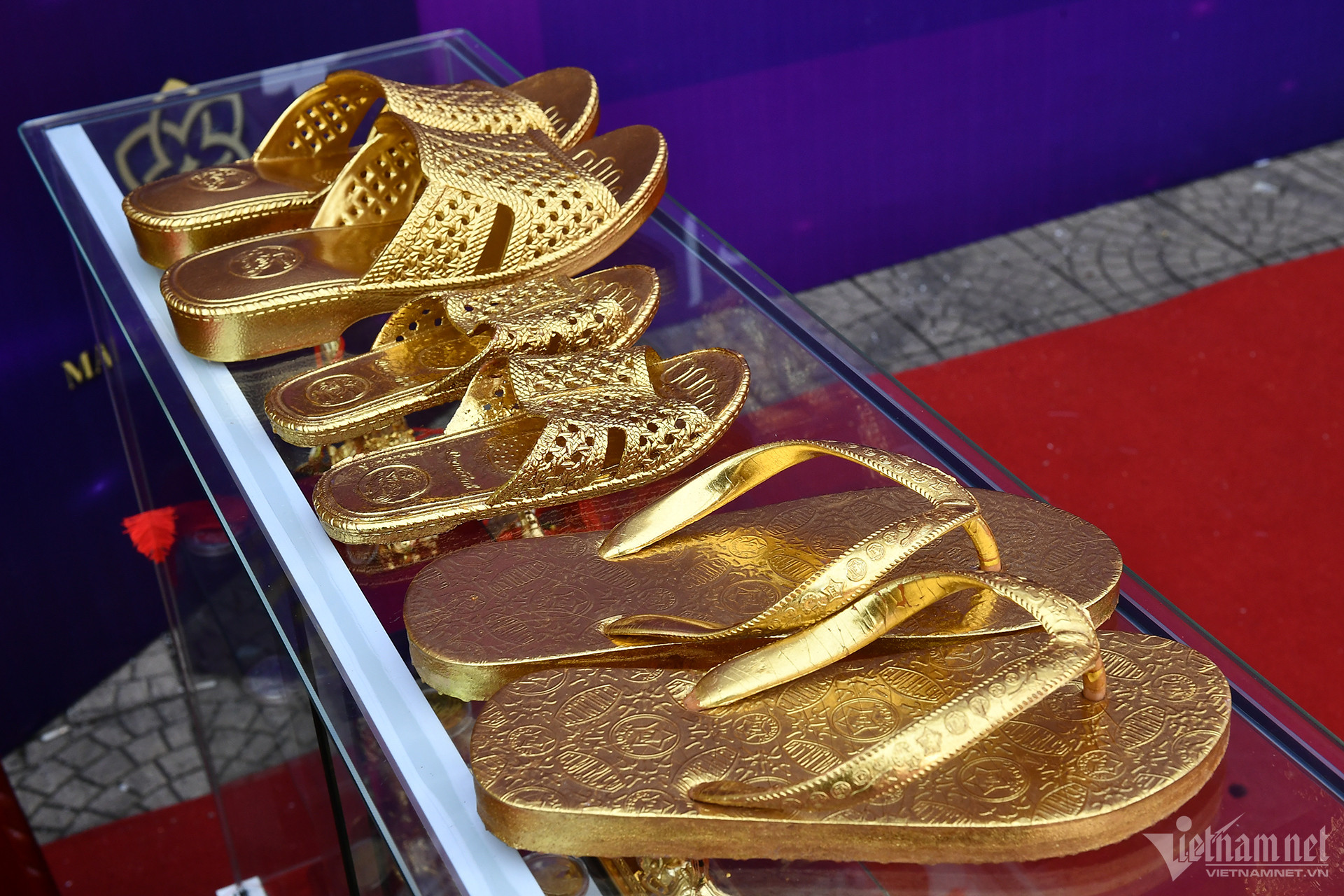 Lạ lẫm nhất là những đôi dép tổ ong, dép tông cũng được mạ vàng 24K bày trên mặt tủ kính.