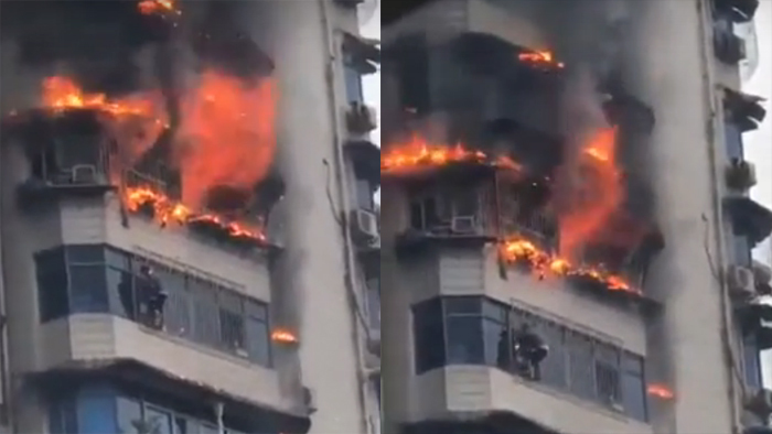 Người đàn ông đu mình ngoài ban công cửa kính của một chung cư cao tầng khi căn hộ của ông bốc cháy ngùn ngụt.