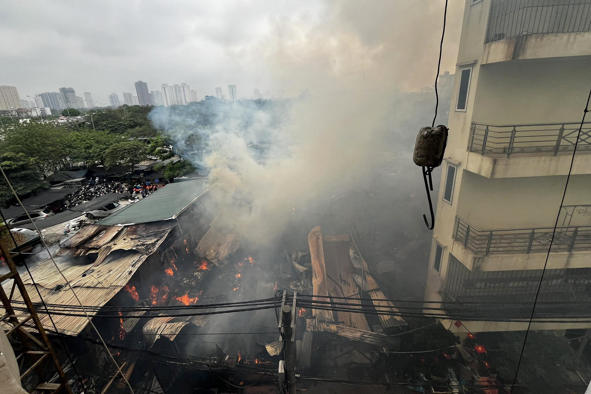 Do chất cháy là gỗ, vật liệu xây dựng bén lửa nên đã tạo cột khói lớn gây khó khăn cho việc dập lửa.