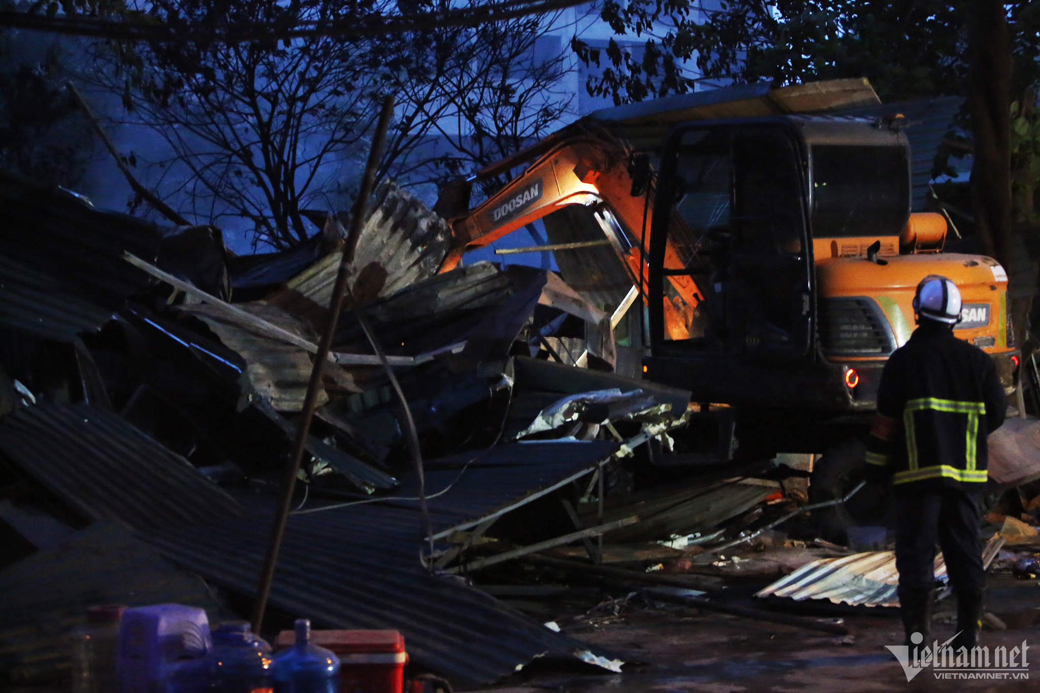 Sau 1 giờ đồng hồ, lực lượng Cảnh sát PCCC đã cơ bản dập tắt ngọn lửa và tiến hành dùng máy xúc kéo đổ các nhà bị cháy để dập tàn, làm mát.