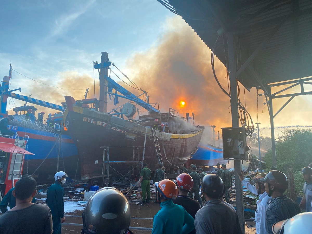 Vụ cháy lớn xảy ra vào khoảng 15h chiều 7/12 tại ụ sửa chữa tàu thuyền ven sông Phú Hài (phường Phú Hài, TP Phan Thiết, tỉnh Bình Thuận) khiến nhiều tàu bị thiêu rụi.