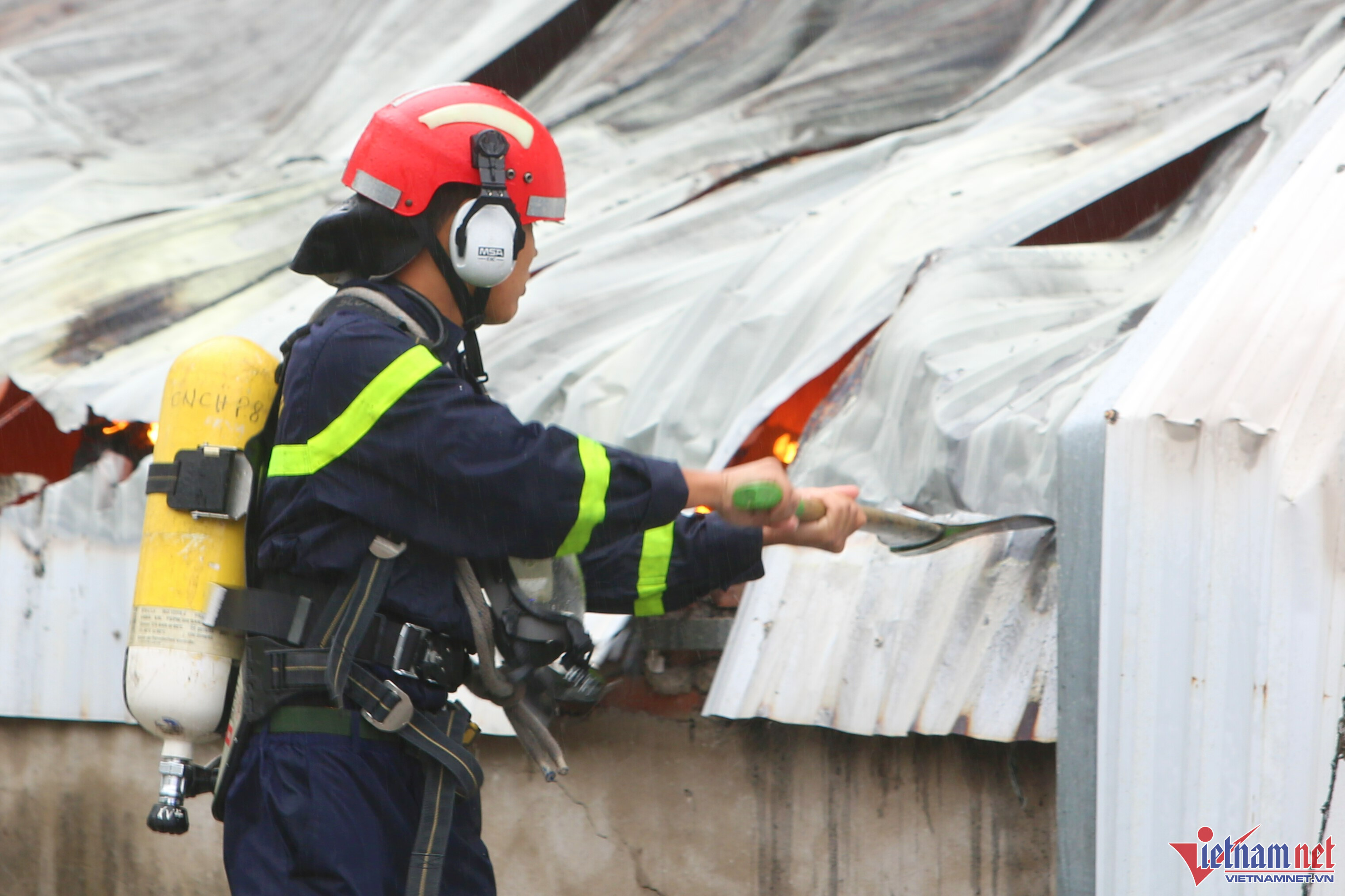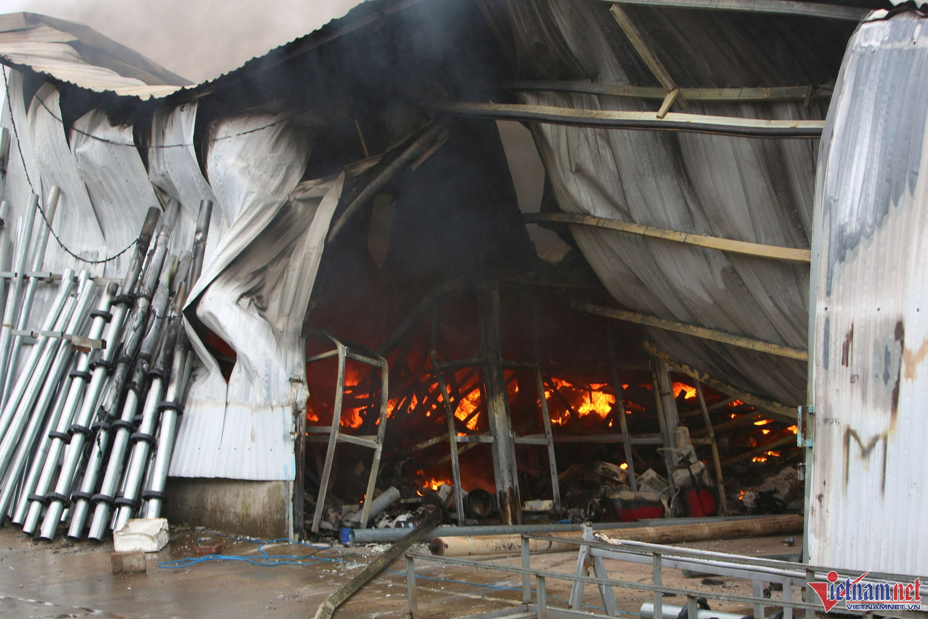 Đến 8h30, ngọn lửa vẫn cháy đỏ bên trong kho. Có ít nhất 2 nhà kho đã bị thiêu rụi. Được biết đây là khu vực cho thuê kho, xưởng. Bên trong các nhà kho này chứa nhiều các loại hàng như sơn, đồ điện tử, đồ tiêu dùng...