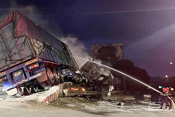 Tại hiện trường, xe container chở vật tư thú y di chuyển theo hướng Nam - Bắc, nằm nghiêng trên giải phân cách, phần cabin bốc cháy dữ dội.