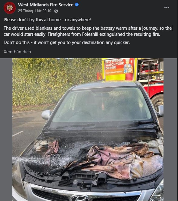 Tài khoản Twitter của Sở Cứu hỏa West Midlands, Anh mới đây đã đăng bài cảnh báo người dân về hậu quả của việc giữ ấm cho ô tô không đúng cách.