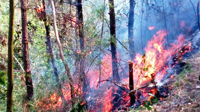 Ngọn lửa bốc lên từ ngọn đồi rồi lan rộng ra rừng thông đặc dụng dễ bắt lửa khiến 6ha thông bốc cháy.