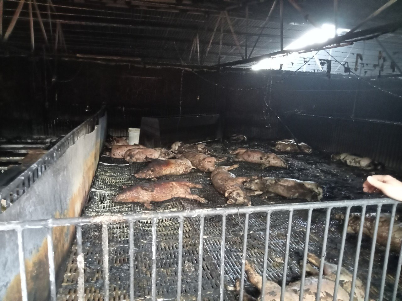 Trang trại lợn trên do ông Nguyễn Văn Quyền (sinh năm 1964) quản lý. Thời điểm trên, trại lợn bị cháy phần mái trần chống nóng khu chuồng nuôi với diện tích hơn 700m2.