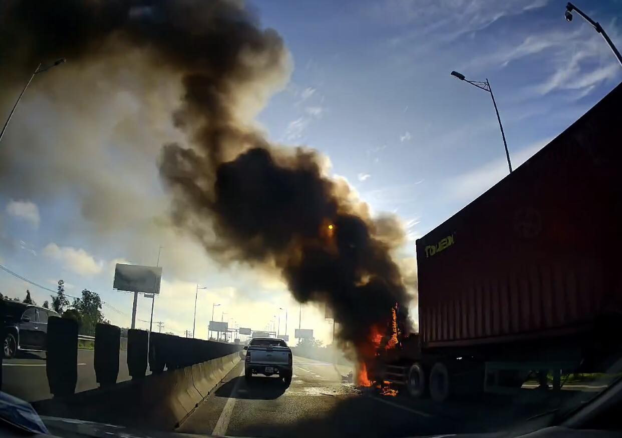 Khi phương tiện vừa chạy qua khỏi trạm thu phí Long Phước, phường Long Phước, TP Thủ Đức (TP.HCM) khoảng 100 mét thì bất ngờ khói lửa bốc lên nghi ngút từ đầu máy xe container.