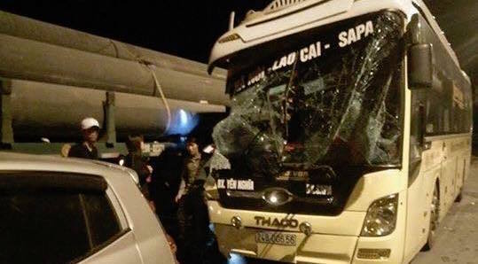 Chiếc xe giường nằm chở 30 hành khách đâm vào đuôi xe tải chạy cùng chiều trên cao tốc Hà Nội - Lào Cai khiến 1 người chết.