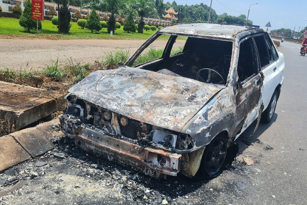 Xe ô tô con hiệu Hyundai Santafe (chưa rõ biển số) đang lưu thông trên đường Hồ Chí Minh đoạn qua thôn 6, xã Kiến Thành, huyện Đắk R'lấp (Đắk Nông) bất ngờ bốc cháy dữ dội.