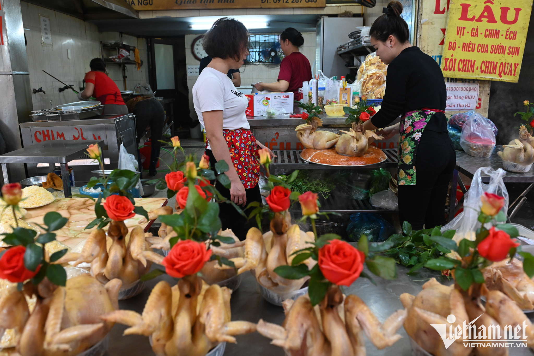 Gà luộc ngậm hoa hồng là một trong những mặt hàng đắt khách ở đây từ dịp lễ Táo quân đến hết ngày 30 Tết. Giá bán là 250.000 đồng/kg, nếu mua cả một con gà cúng, giá khoảng 600.000 đồng.