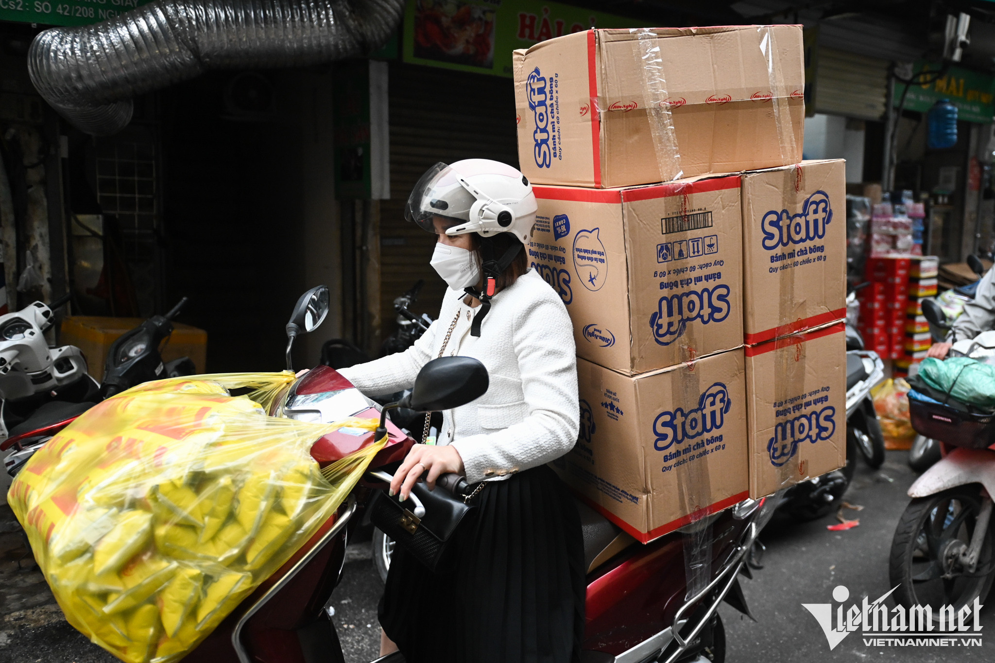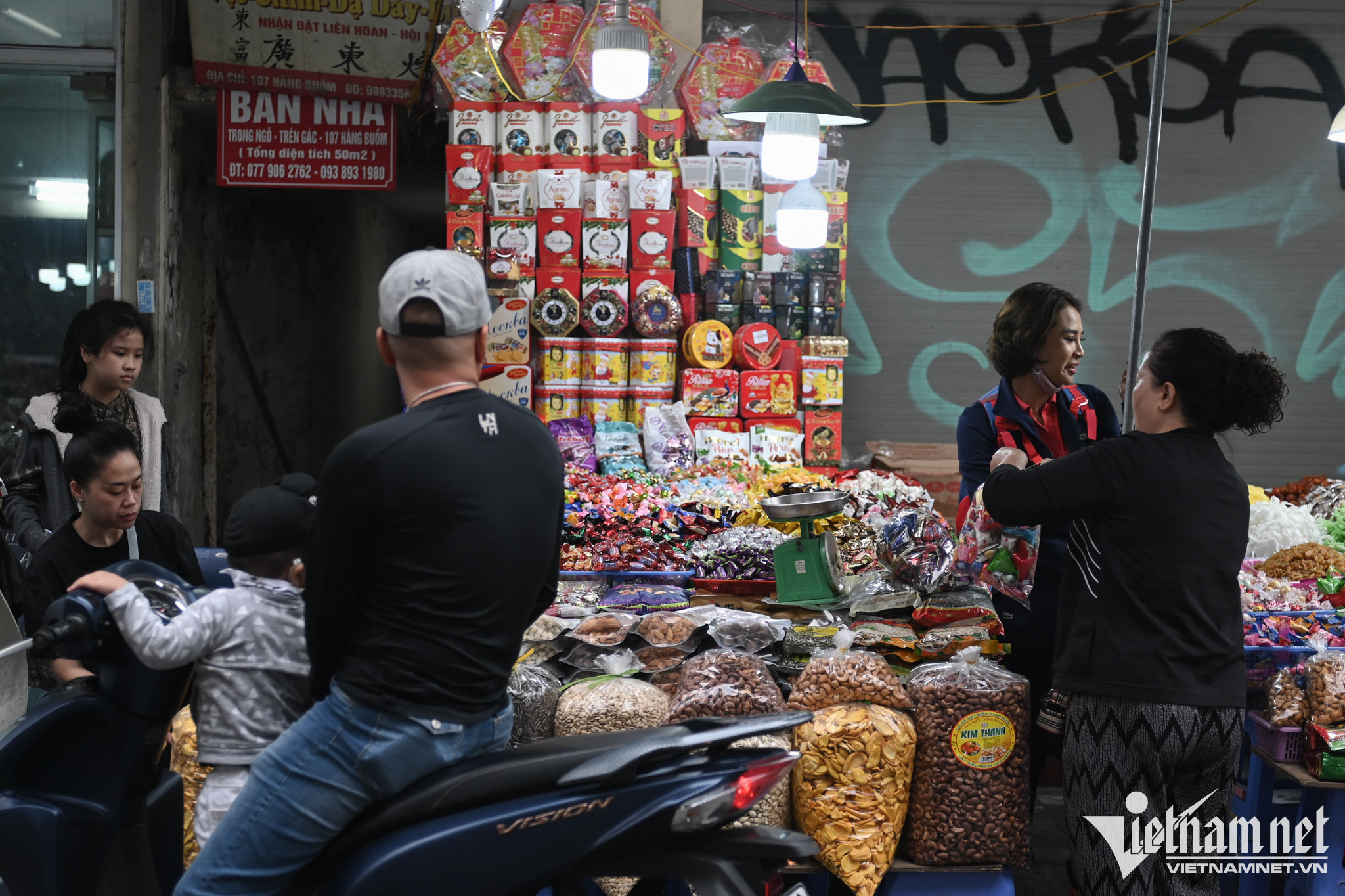 Phố Hàng Giầy, Hàng Buồm (quận Hoàn Kiếm) - "thủ phủ" của bánh kẹo, mứt Tết ngay từ 10h sáng, đông đúc người qua lại khi tiểu thương liên tục nhập hàng, khách chen chân chọn lựa đồ ăn thức uống.