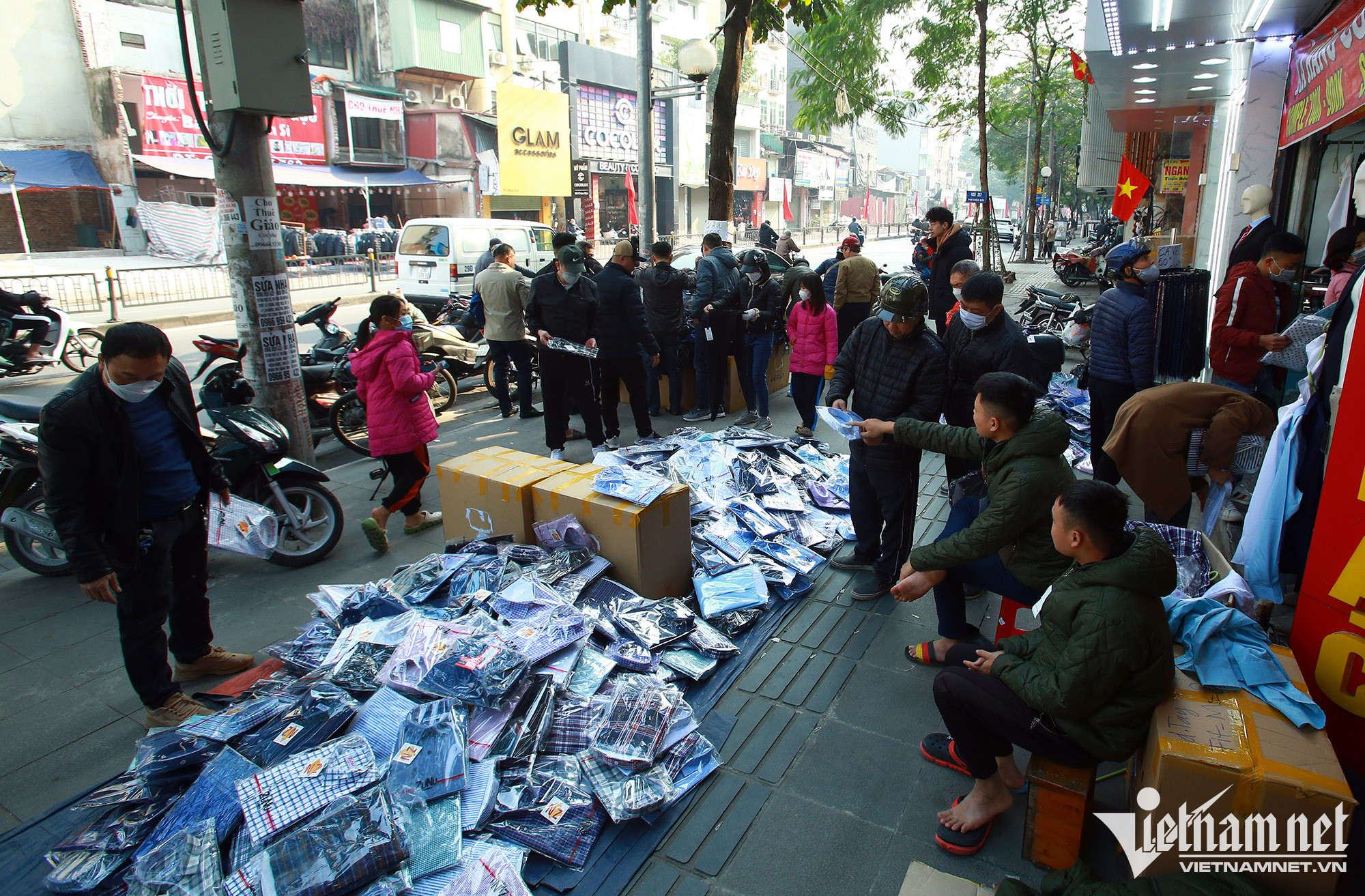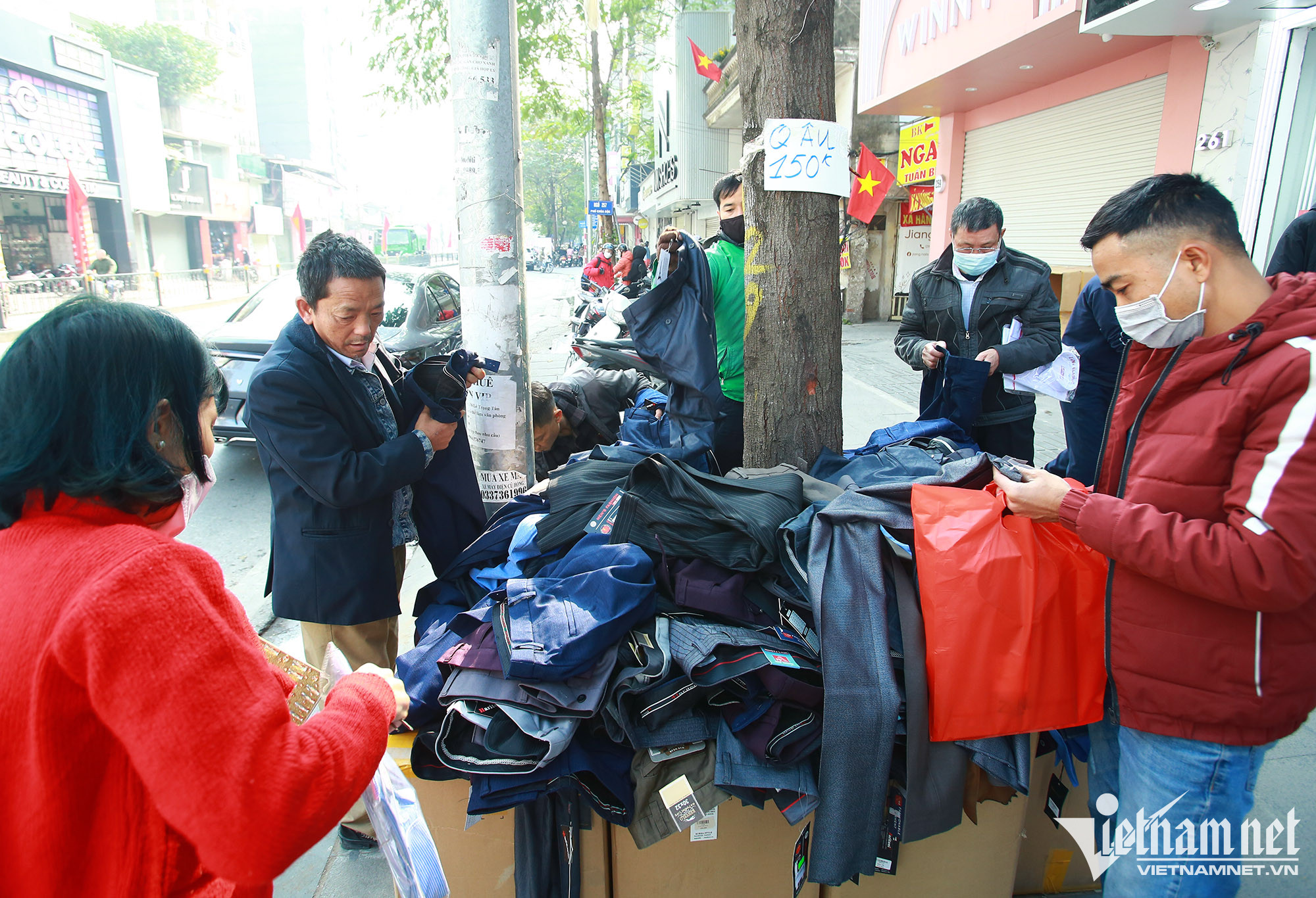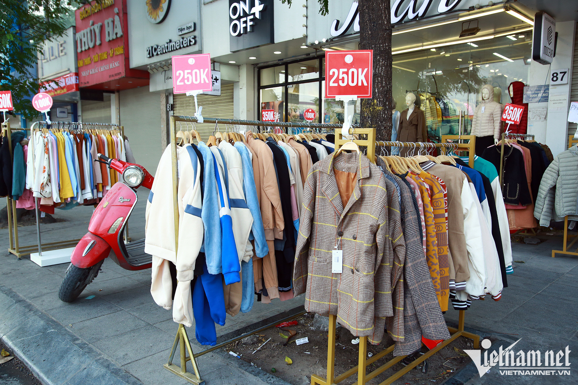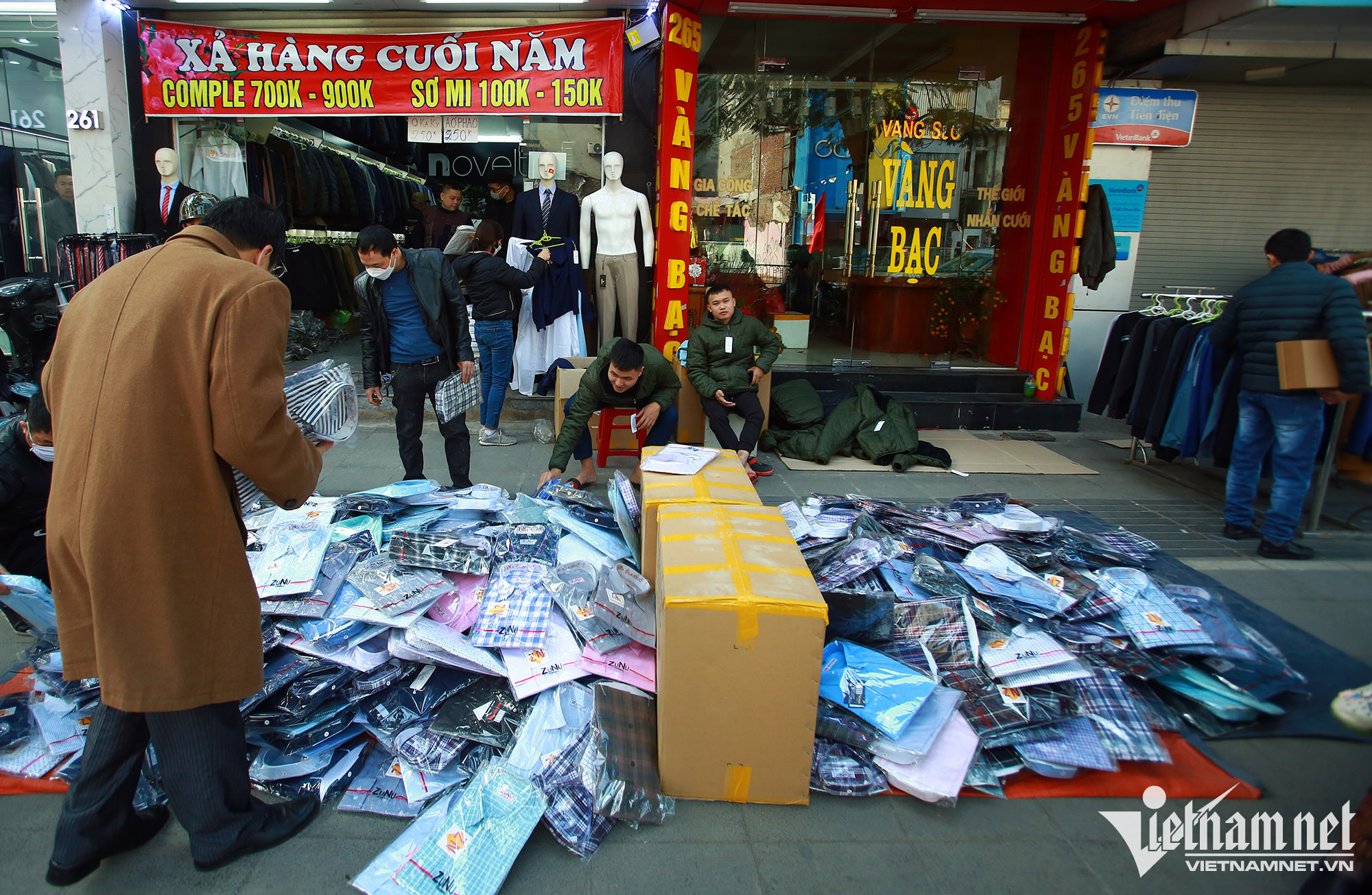 Sáng 30 Tết, các cửa hàng thời trang trên phố Chùa Bộc đồng loạt hạ giá hoặc bán đồng giá với giá rẻ hơn ngày thường.Áo sơ mi dài tay, ngắn tay được đổ đống ra vỉa hè, giá chỉ từ 100.000 - 150.000 đồng.Rất nhiều tiệm thời trang quảng cáo xả hàng ngày này. Có những bộ đồ giảm giá đến 70%, thu hút sự quan tâm của người qua lại.Quần âu chất đống dưới gốc cây bán đồng giá 150.000 đồng/chiếc.Nhiều khách tranh thủ chọn tới vài bộ áo sơ mi có màu sắc khác nhau vì giá quá rẻ.Chủ một cửa hàng quần áo trên phố Chùa Bộc cho biết, nhiều mẫu bán bằng hoặc thấp hơn giá nhập để thu hồi vốn và dọn kho chuẩn bị cho mẫu mã mới sau TếtTrưa 30 Tết, cánh mày râu đổ xô đi chọn quần áo thời trang. Trước đây, tuyến phố này chỉ thấy chủ yếu phụ nữ đi mua đồ.Bày bán ngoài vỉa hè, không có phòng thử đồ nên nhân viên bán hàng mặc luôn các sản phẩm này để khách hàng dựa vào đó chọn kích cỡ cho thuận tiện.Trên đường Nguyễn Trãi, quần áo cũng được đổ đống ra vỉa hè bầy bánNhiều "shop thời trang" tại đây cũng bầy bán trên vỉa hè nhưng vắng khách.Một "shop" thời trang hàng hiệu trên phố Huế cũng xả hàng ngày cuối năm.Vỉa hè chợ Hôm bầy bán giày, dép hạ giá thu hút khách, giá từ 50.000 - 150.000 đồng, tùy loại.