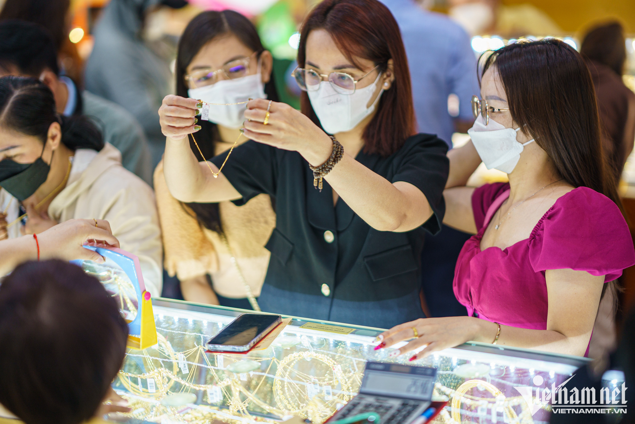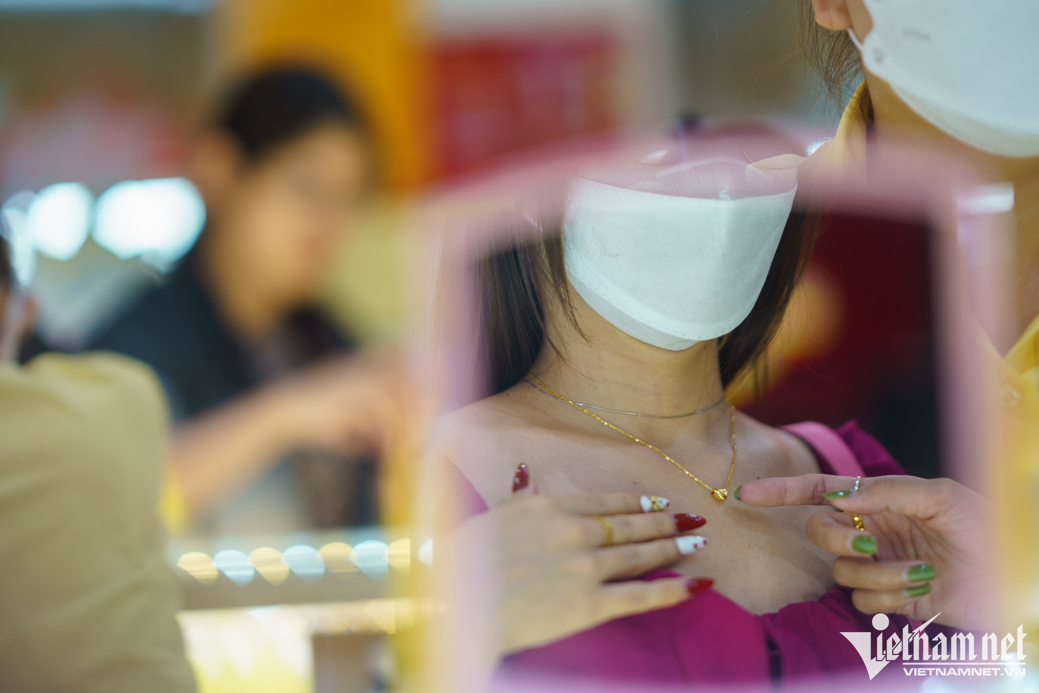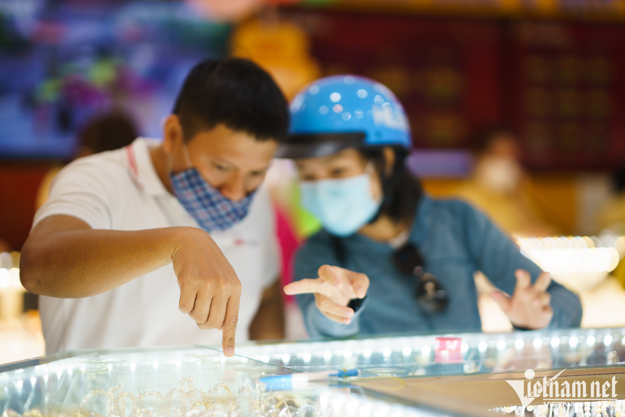 Nhóm bạn của chị Nguyễn Thị Sang (32 tuổi) cho biết, từ sáng sớm đã tranh thủ đi mua vàng cầu may. Năm nay, chị chọn mua miếng vàng nhẫn để giảm thiểu lỗ, với mong muốn làm ăn phát lộc, phát tài trong năm mới.
