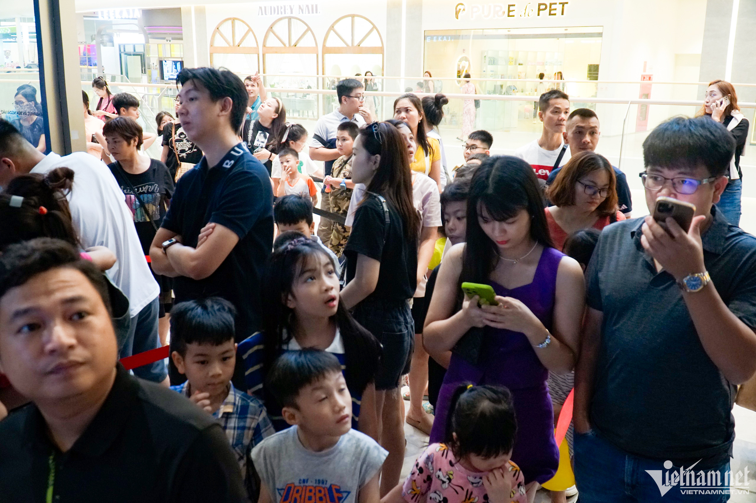 Nhiều phụ huynh và trẻ nhỏ đứng xếp hàng tại khu vực vui chơi dành cho trẻ nhỏ trong trung tâm thương mại.