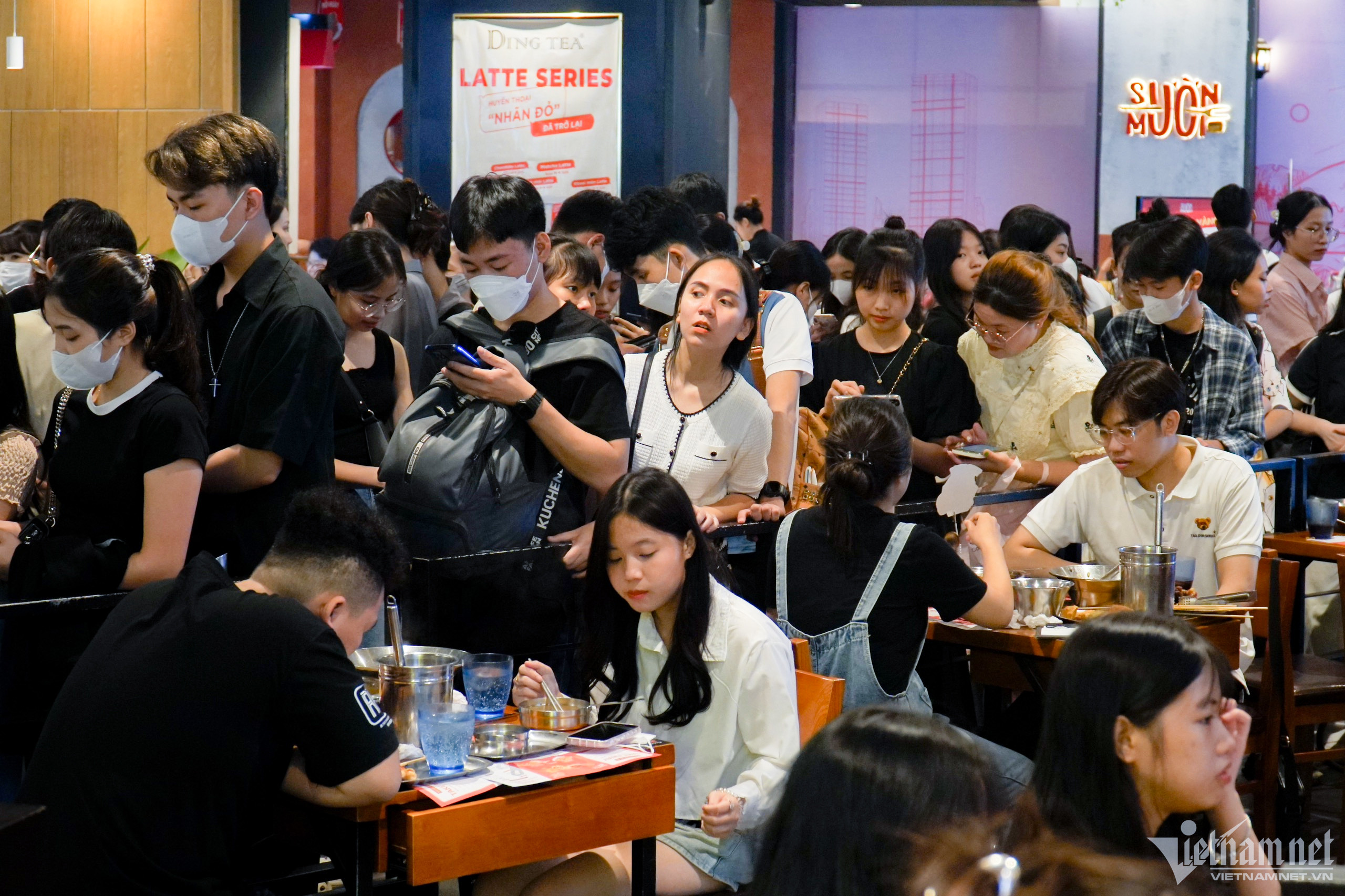 12h30 tại một hàng lẩu kiểu Hàn Quốc, bên ngoài khách đứng xếp thành 2 hàng chờ có bàn để vào ăn trưa.