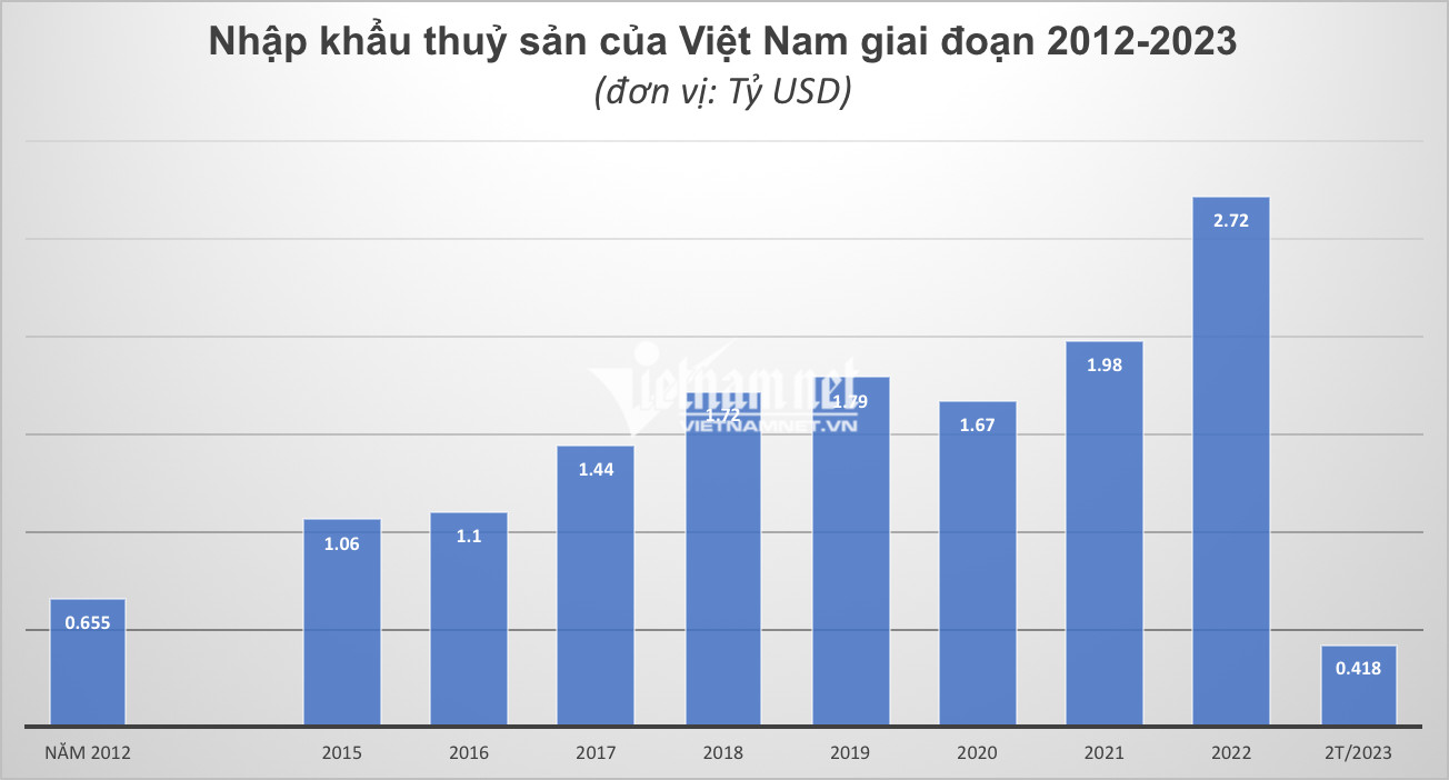 Sang năm 2022, nước ta chi tới 2,72 tỷ USD để nhập khẩu các thuỷ sản, tăng 25% so với năm trước đó. Đây cũng là con số kỷ lục, gấp hơn 4 lần so với kim ngạch nhập khẩu năm 2012.