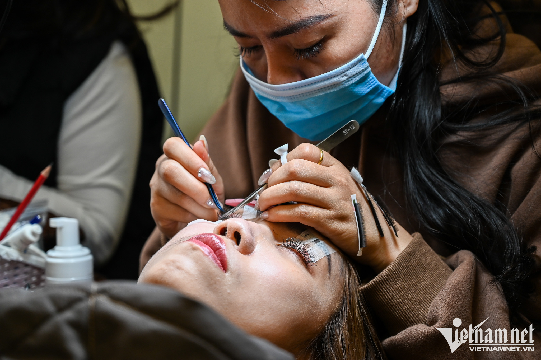 Giáp Tết cũng là thời điểm đắt khách của nhiều spa và dịch vụ làm mi. Tại spa trên đường Hào Nam, chị Hoa (chủ cửa hàng) không nhận đặt lịch của ai vì quá đông, cứ ai đến trước sẽ được phục vụ trước.