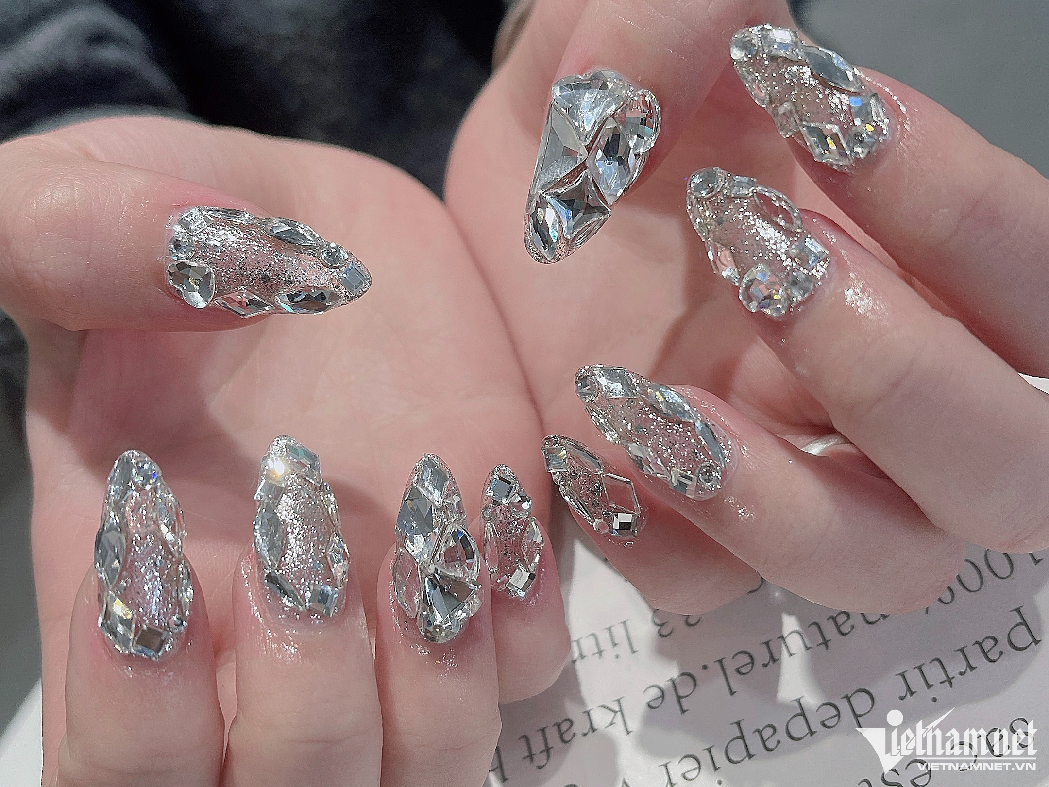 Cũng theo chia sẻ của người quản lý, một mỗi bộ sơn sửa có giá từ 210.000 đồng. Khách hàng đến thường làm úp móng và đính đá, mỗi bộ có giá từ 300.000 đến 700.000 đồng. Nếu sử dụng thêm dịch vụ trang trí bằng nhiều loại phụ kiện, giá mỗi bộ có thể lên đến 3 triệu đồng. Trong hình là bộ móng mà chị Cải mới làm xong cho khách có giá 2,5 triệu.