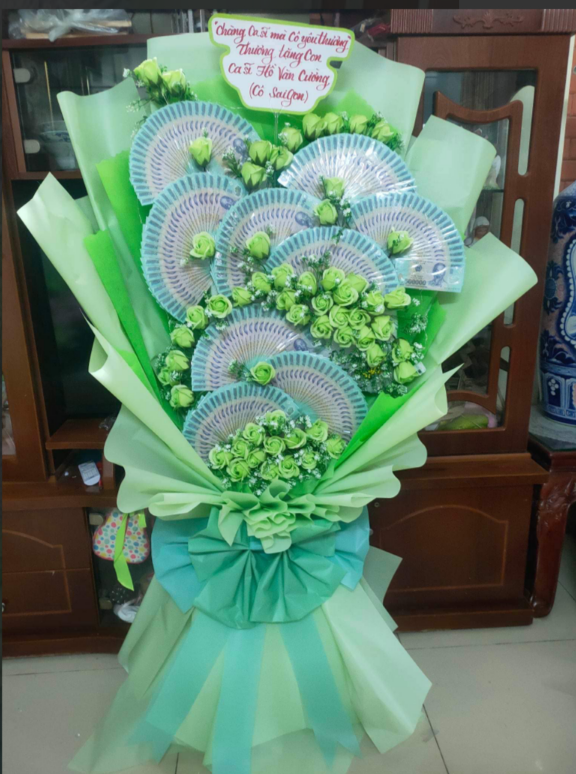 Bó hoa trị giá hơn 100 triệu tiền mặt Hồ Văn Cường được người hâm mộ tặng.