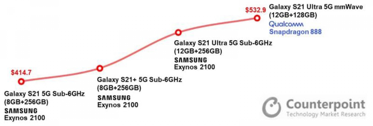 Dựa trên danh sách các thành phần, chi phí sản xuất của Galaxy S21 Ultra cao cấp nhất với bộ nhớ trong 128 GB là 533 USD, thấp hơn 7% so với Galaxy S20 Ultra. Đây là chi tiết khá thú vị khi mà dòng sản phẩm mới có sự gia tăng đáng kể về hiệu suất và việc chuyển sang sử dụng chip Snapdragon 888 đắt tiền hơn nhiều so với Exynos 990.