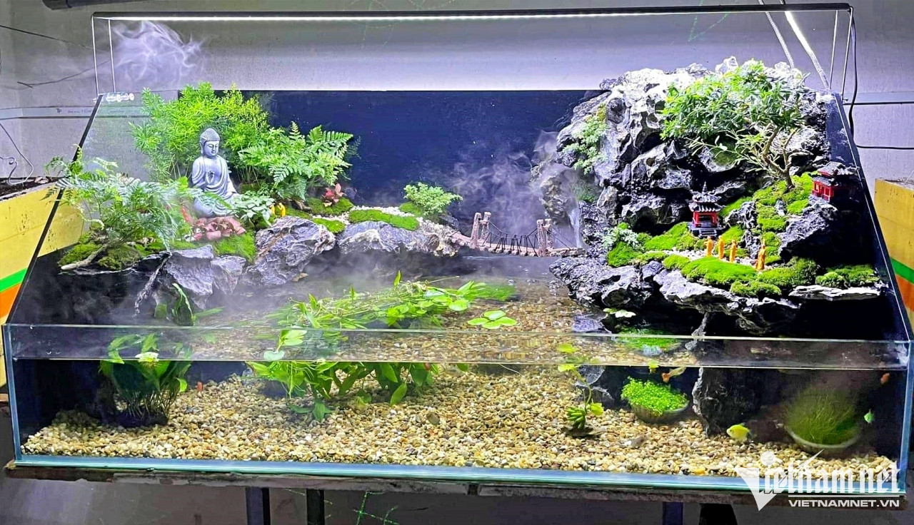 Tại đây, Thanh bị thu hút bởi một bể cá cảnh được thiết kế vô cùng lạ mắt. Các loại cây trong bể không ngập dưới mặt nước mà được trồng trên những hòn non bộ bằng đá. Bên dưới, hồ vẫn có nước để nuôi cá cảnh.