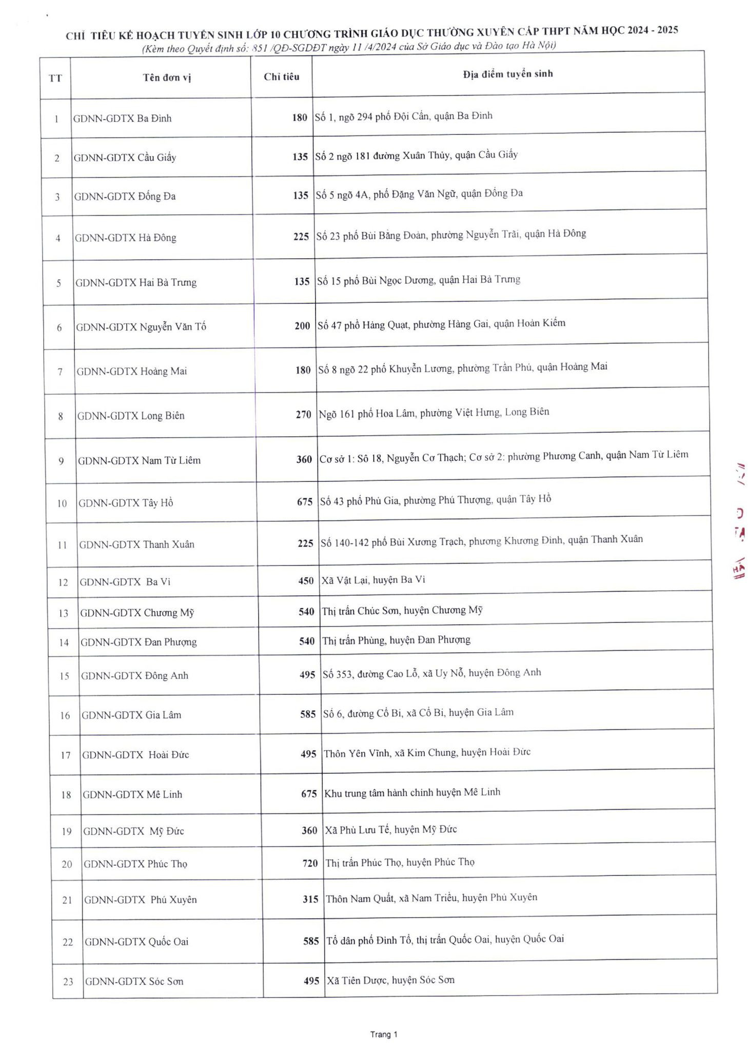Chỉ tiêu lớp 10 trung tâm GDTX: