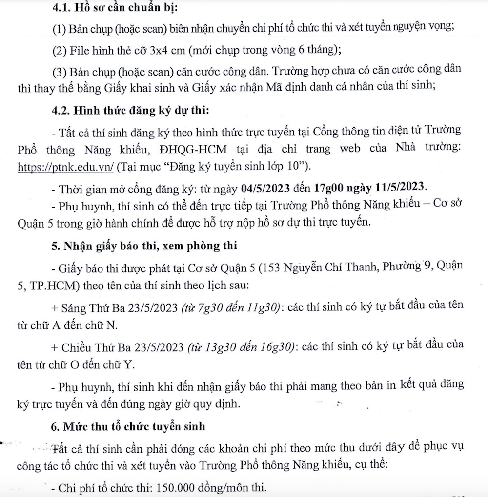 Trường Phổ thông Năng khiếu tổ chức một kỳ thi chung cho cả 2 cơ sở với 10 môn thi. 3 môn không chuyên gồm Toán, Ngữ văn, Tiếng Anh; 7 môn chuyên gồm: Toán, Tin học, Vật lý, Hóa, Sinh, Ngữ văn, Tiếng Anh.