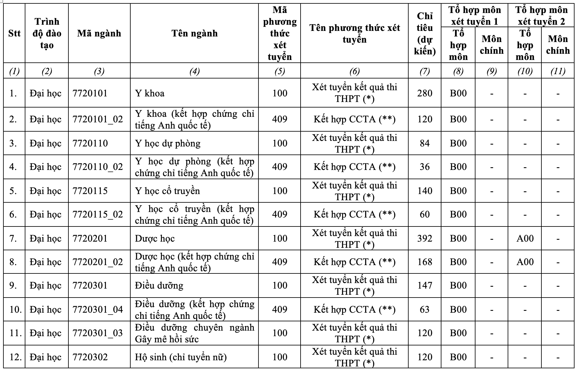 Các ngành còn lại chỉ xét tổ hợp B00: Toán, Hóa học, Sinh học.