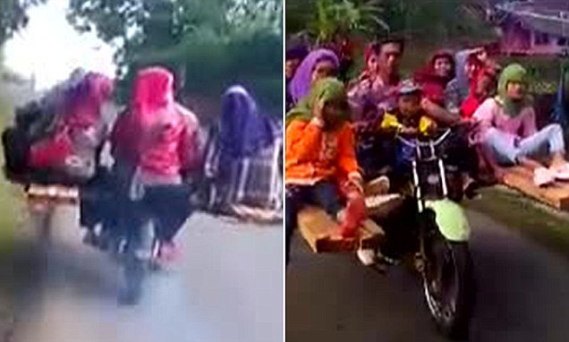 Một người đi xe máy tại vùng nông thôn Indonesia đã chở theo 8 hành khách khác trên hai miếng gỗ gắn vào thân xe.