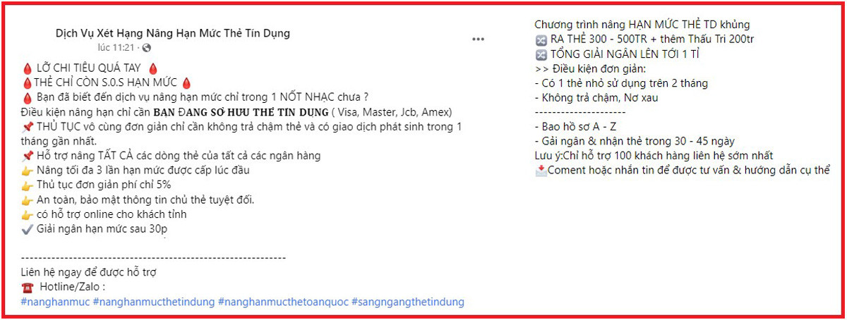 Kịch bản được các nhóm đối tượng đưa ra để lừa người dùng thẻ tín dụng khá tinh vi, với 4 bước. Trong đó, trước tiên, chúng tạo các bài đăng trên những trang mạng xã hội có nội dung hỗ trợ nâng cấp hạn mức thẻ tín dụng, sang ngang thẻ tín dụng… với lời mời gọi thủ tục nhanh chóng, duyệt hồ sơ siêu tốc, phê duyệt tự động, giải ngân trong ngày... Người dùng tin tưởng các bài đăng, sẽ liên hệ với các đối tượng. Ngoài ra, các đối tượng cũng có thể mua bán dữ liệu người dùng, trong đó bao gồm thông tin tin cá nhân, hạn mức thẻ tín dụng… để xác định những nạn nhân tiềm năng.