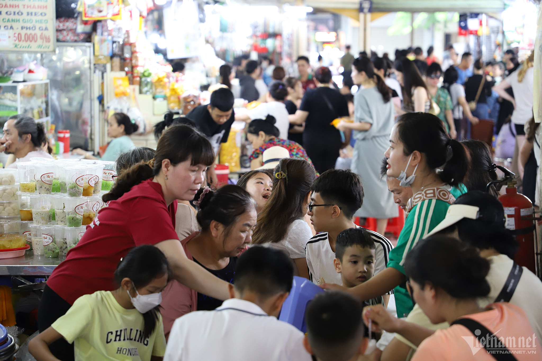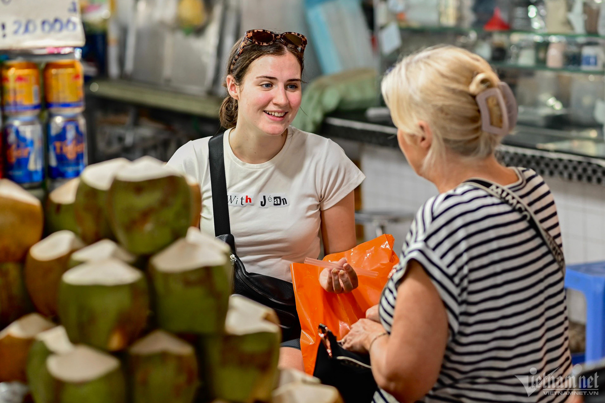 Hai du khách nước ngoài tham quan một vòng không mua được gì, đã dừng chân thưởng thức nước dừa tươi. Thời điểm chợ đông đúc cũng là lúc các hàng phục vụ nước giải khát, thức ăn nhanh hoạt động hết công suất. Điều này đối lập với tình trạng "xem nhiều, nhác mua" tại các gian bách hóa tổng hợp, quà lưu niệm.