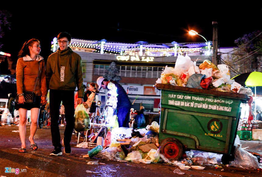 | Chị Thảo, nhân viên dọn vệ sinh của chợ đêm nói ở đây chia làm 3 ca để quét dọn nhưng vào những đợt cao điểm vẫn không đảm bảo được vệ sinh sạch sẽ. "Du khách đổ về quá đông, chợ lại thiếu thùng rác công cộng nên nhóm của chị thường phải làm việc đến đầu giờ sáng hôm sau mới xong việc", chị cho biết. |