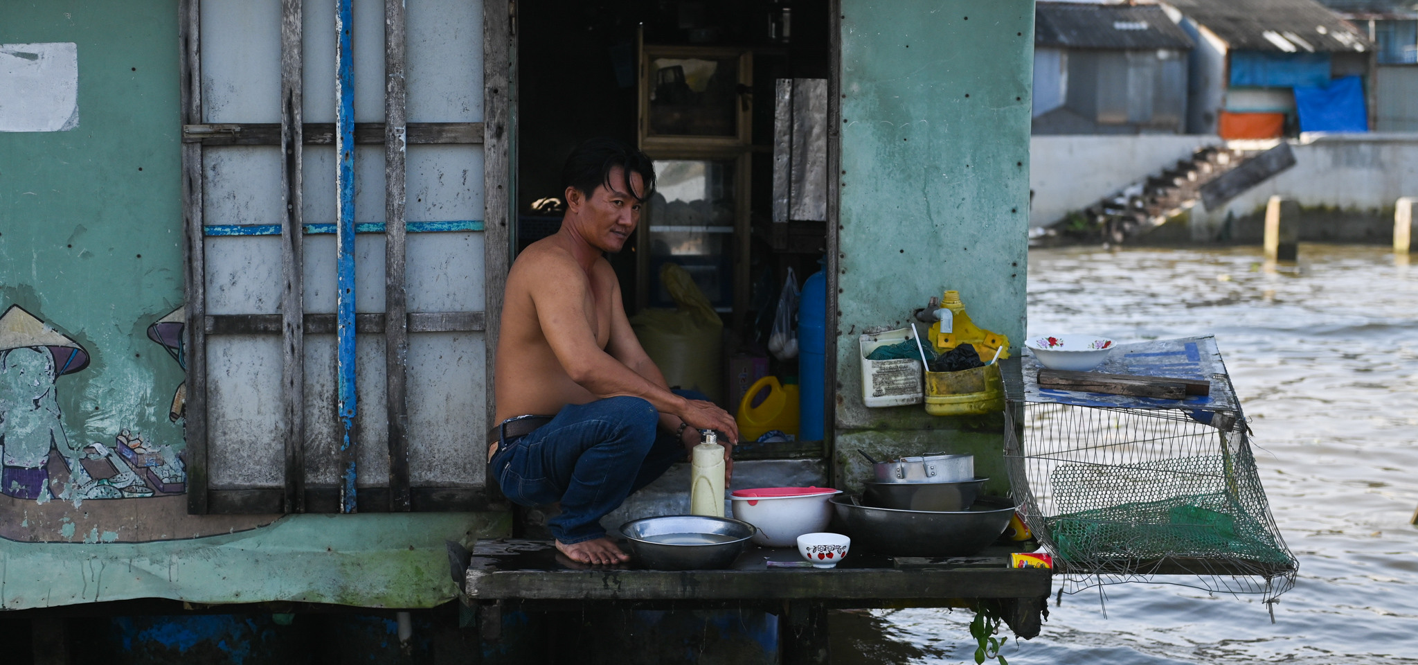 Khu nhà xập xệ là nơi ở của hàng chục hộ gia đình là các lao động tại chợ nổi Cần Thơ. Họ đã sống ở đây nhiều năm, đều đặn mỗi sáng lấy hàng, đi bán rồi quay trở về nhà.