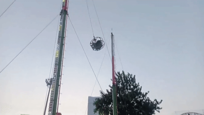 Đoạn video ghi lại cho thấy, 2 du khách ngồi trong một quả cầu sắt và được ném lên cao bằng 2 sợi dây cáp. Tuy nhiên, khi quả cầu vừa bay lên cao thì một sợi dây cáp bất ngờ bị tuột khiến quả cầu văng sang trái và rơi tự do xuống dưới.