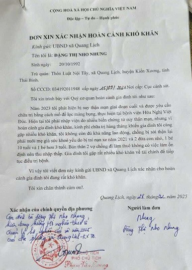 Phòng CTXH Bệnh viện Việt Đức xác nhận: Bệnh nhân Đặng Thị Nho Nhung (33 tuổi) được chẩn đoán suy thận giai đoạn cuối, đang lọc màng bụng. Hoàn cảnh gia đình khó khăn, chồng làm nghề tự do, nuôi 2 con nhỏ, ở cùng mẹ tuổi cao. Bệnh nhân sử dụng nhiều loại thuốc ngoài bảo hiểm tốn kém. Phương án điều trị duy trì sự sống là ghép thận có chi phí rất tốn kém. Gia đình bệnh nhân đang rất cần sự giúp đỡ.